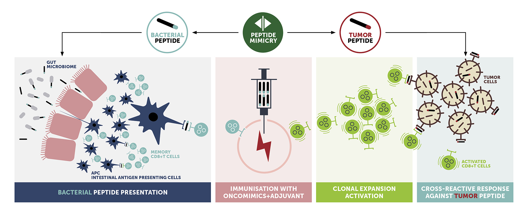 OncoMimics™ are a specific combination of bacterial peptides, derived from bacteria present in the gut microbiome, that closely mimic either overexpressed tumor-associated antigens (TAAs) or lineage-specific markers in solid and liquid tumors, respectively.